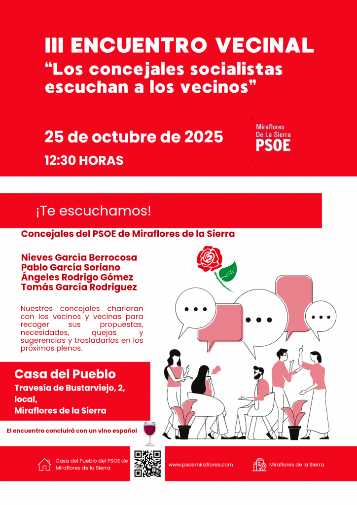 🏡 ¡Participa en el III Encuentro Vecinal con los concejales del PSOE de Miraflores de la Sierra! 📅 Sábado, 25 de octubre de 2025🕧 12:30 horas 📍 Casa del Pueblo de Miraflores de la Sierra Un año más, abrimos las puertas de la Casa del Pueblo para escucharte, compartir ideas y seguir construyendo juntos y […]