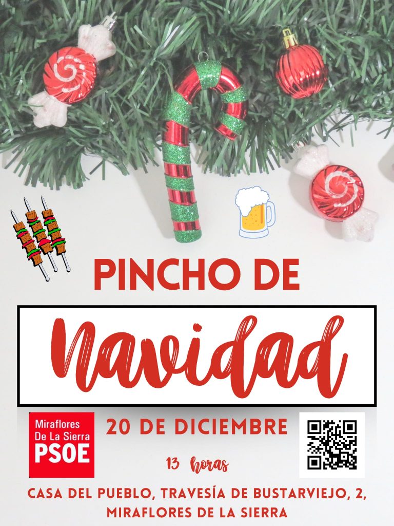 El sábado 20 de diciembre, a las 13 horas, te invitamos a pasar por la Casa del Pueblo para disfrutar juntos del Pincho de Navidad del PSOE de Miraflores de la Sierra.